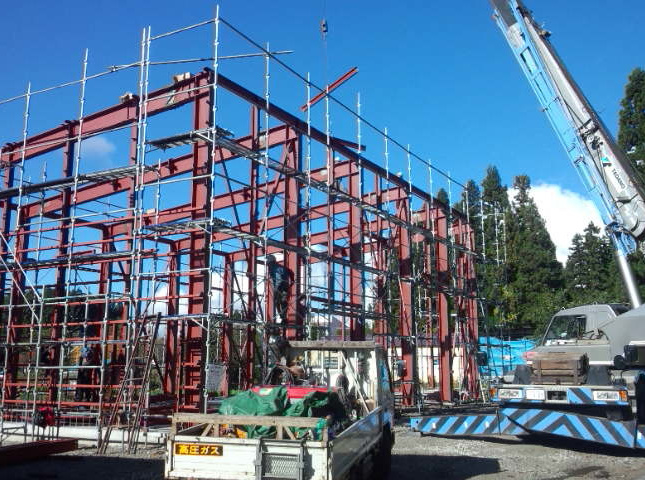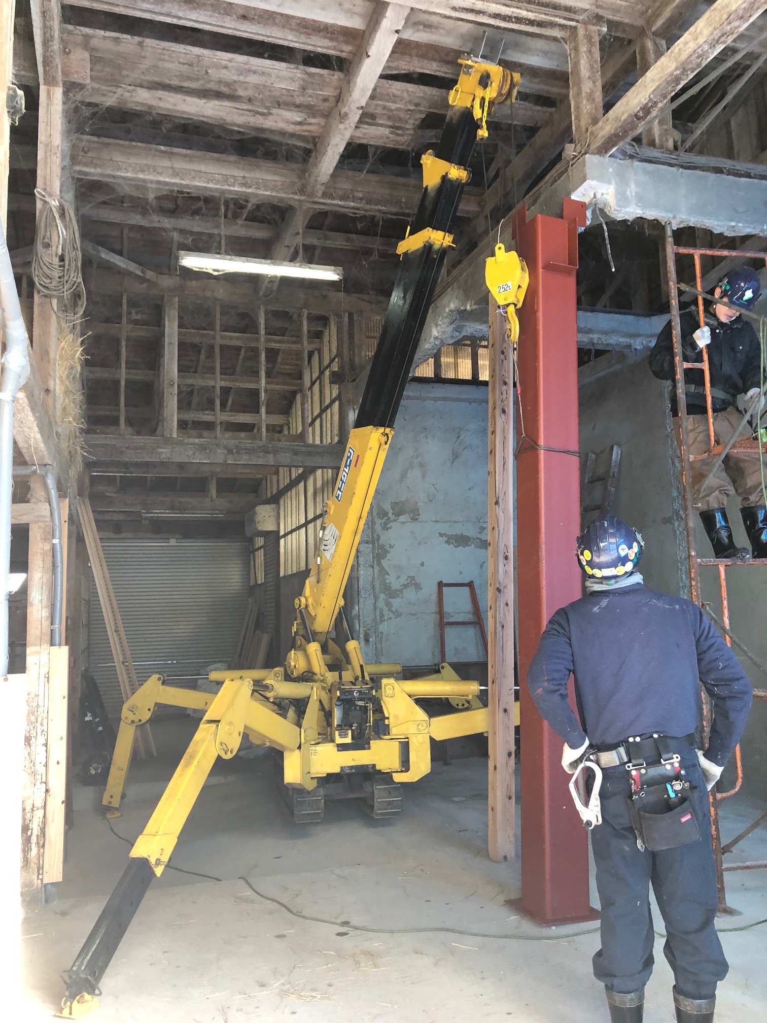 カニクレーンを使用して車両が入れない建物内に補強用の鉄骨を設置いたしました。